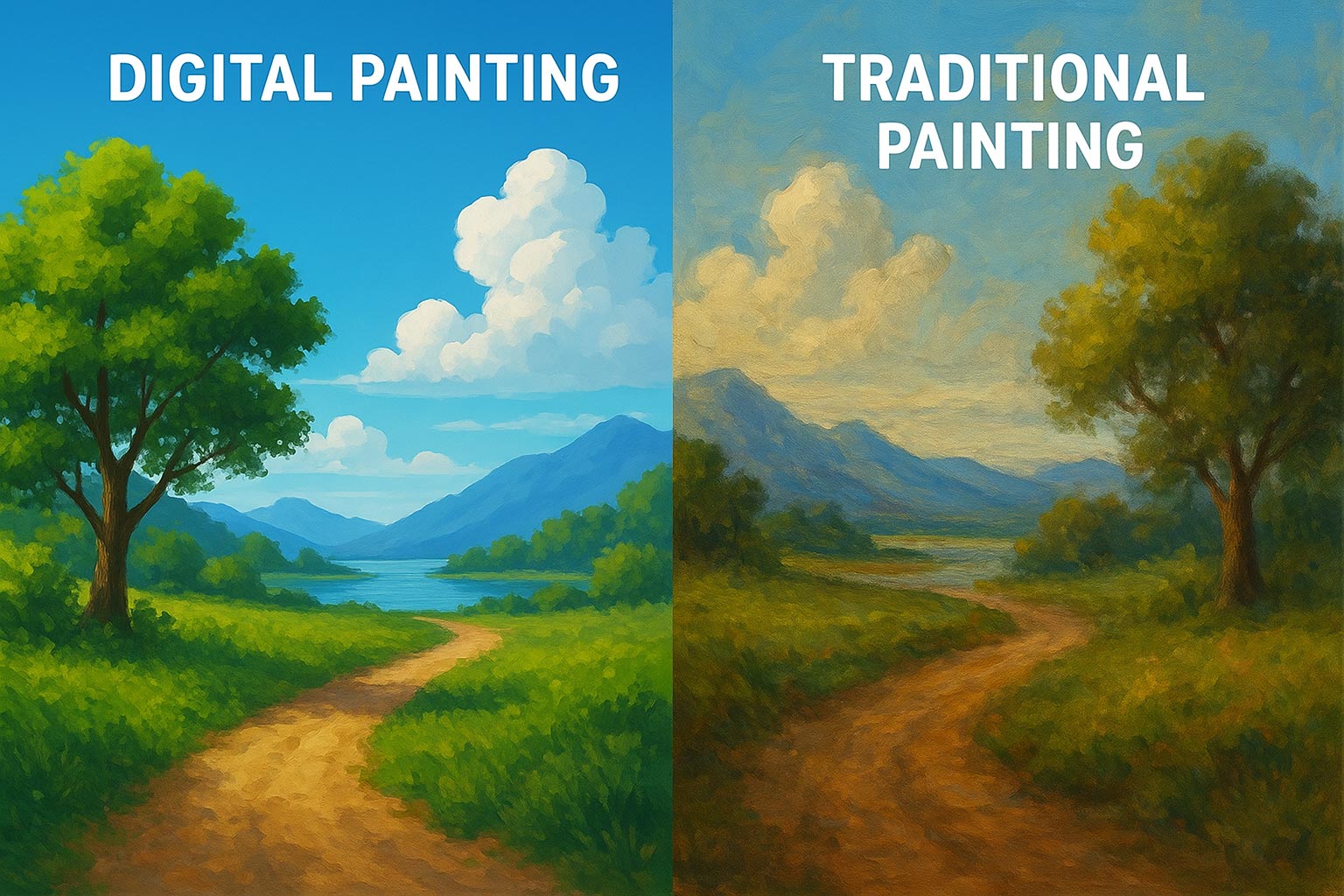 یکی از پرسشهای همیشگی دربارهٔ نقاشی دیجیتال این است که «چقدر با نقاشی سنتی تفاوت دارد؟» پاسخ این سؤال ساده نیست، زیرا این دو جهان هم شباهتهای زیادی دارند و هم تفاوتهای بنیادین. در سطح پایه، هر دو بر پایهٔ اصول هنری مشترکی مثل ترکیببندی، رنگشناسی، نور و سایه، پرسپکتیو و بیان خلاقیت شکل گرفتهاند. هنرمند چه روی بوم نقاشی کند و چه روی صفحهنمایش، همچنان نیازمند دانش پایهٔ هنر است تا اثری تأثیرگذار خلق کند.